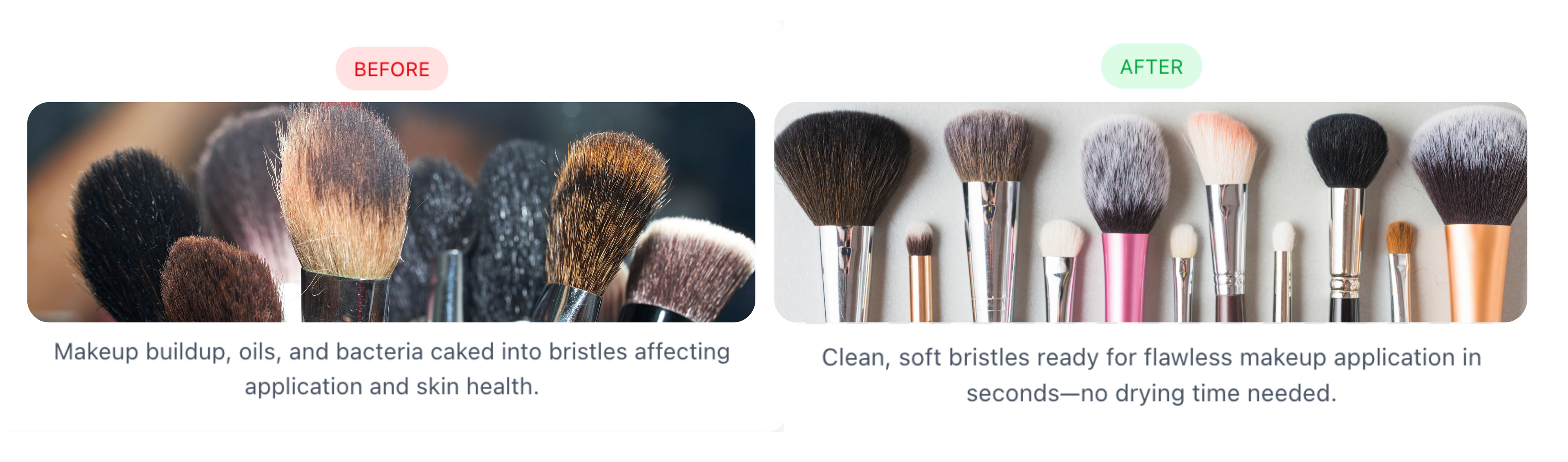 BrushCleanPro is designed to clean and dry makeup brushes instantly without water. Unlike traditional soaps that require rinsing and long drying times, BrushCleanPro’s rinse-free formula removes makeup, dirt, and oils in seconds so your brushes are ready to use right away.